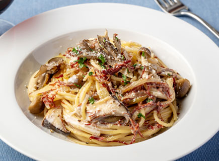 牛乳を加え、ひと煮立ちしたら塩、黒こしょうで味を調える。①を加えて全体をからめ、皿に盛りつける。