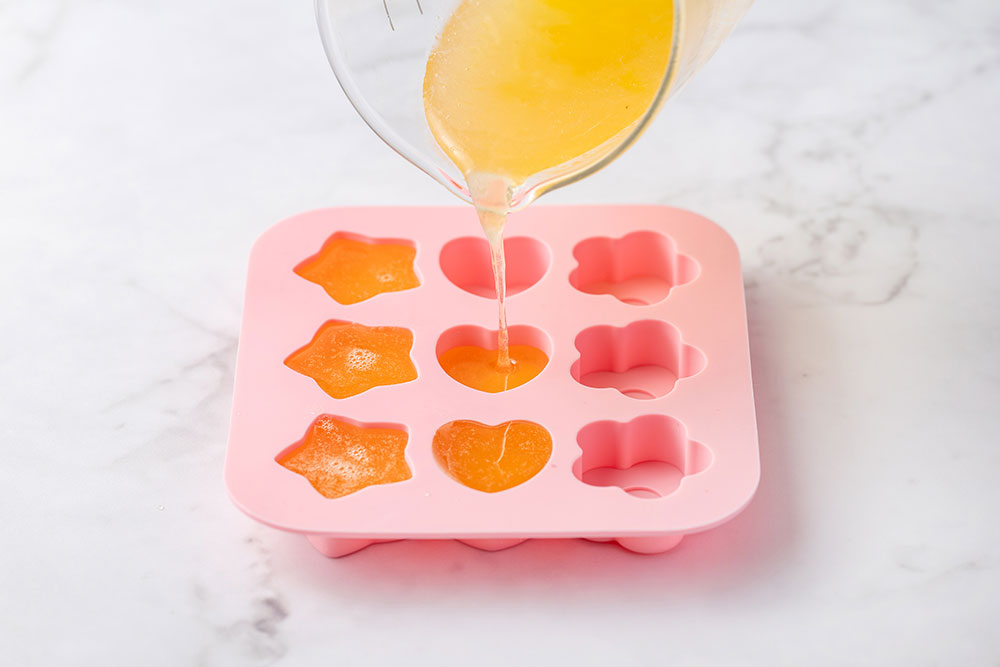 シリコン型に流し込み、冷蔵庫で冷やし固める。しっかり固まったら、型から外す。