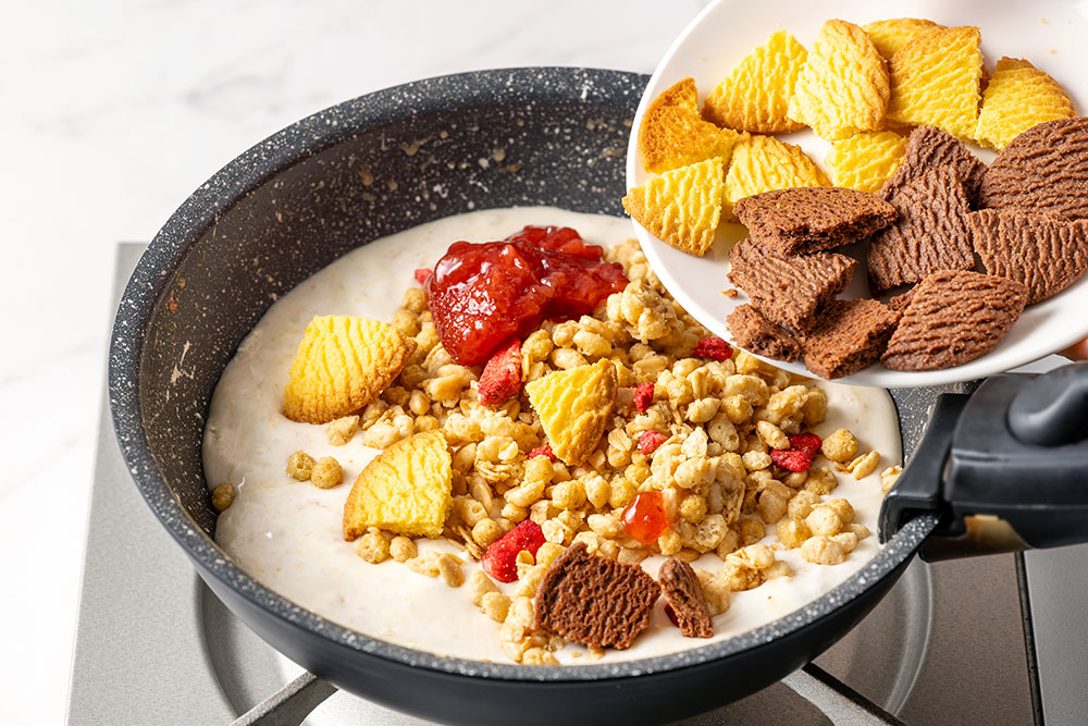 マシュマロが溶けたら、火を止め、スキムミルクを入れて手早く混ぜる。