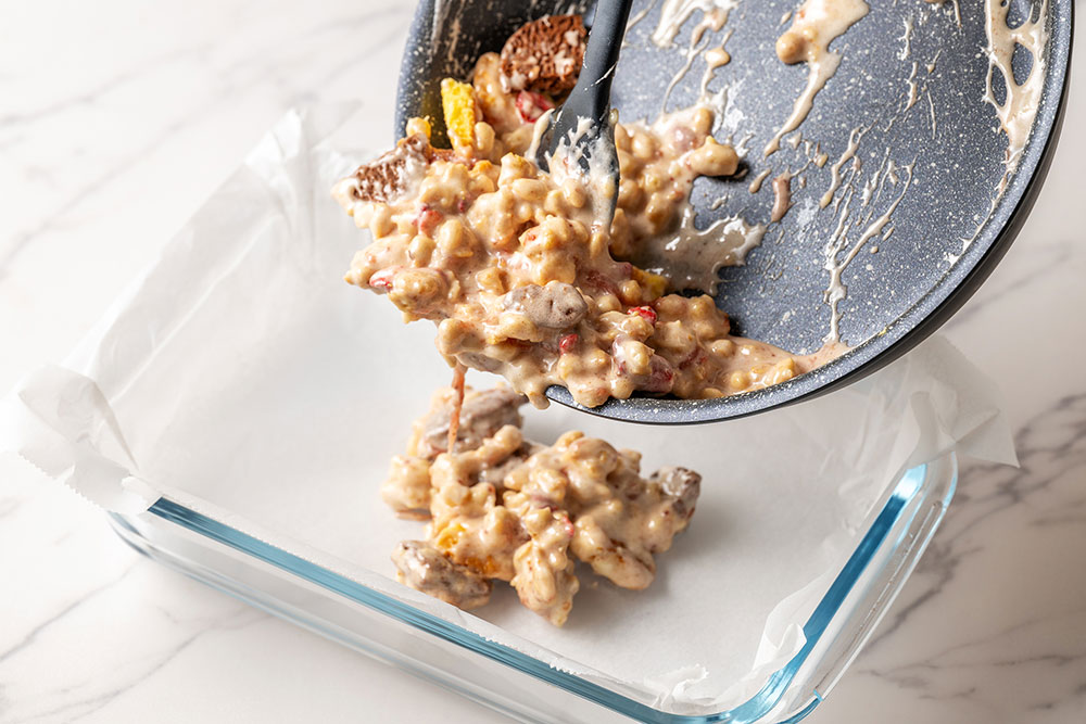 <A> を加えてさっくりと混ぜ、クッキングシートを敷いた耐熱容器に流し、形をととのえる。